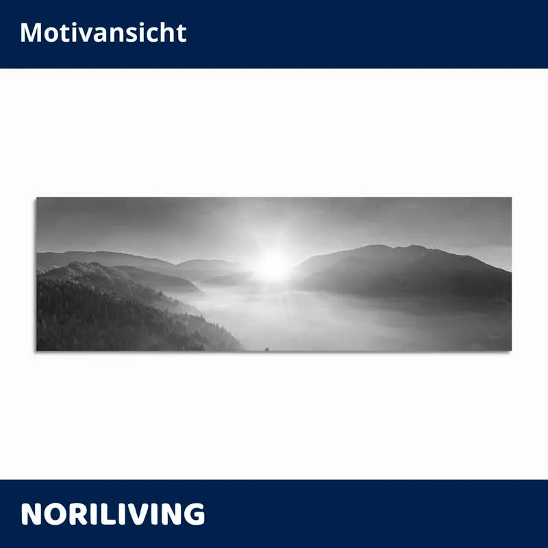 Klebefolie Morgensonne über nebliger Berglandschaft mit Wald 565 schwarz-weiß